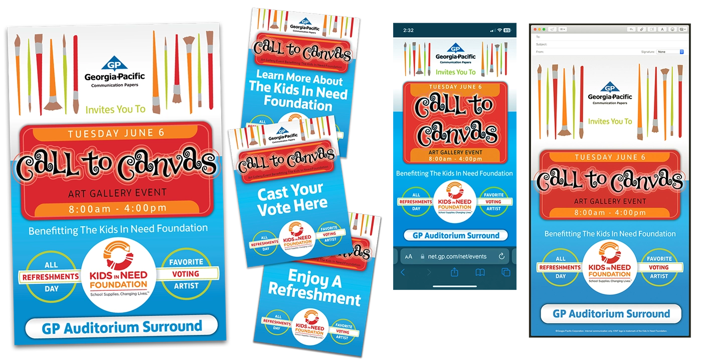 Design “Call to Canvas” logo and assets for printed posters, flyers, event signage, and responsive HTML email invitation.