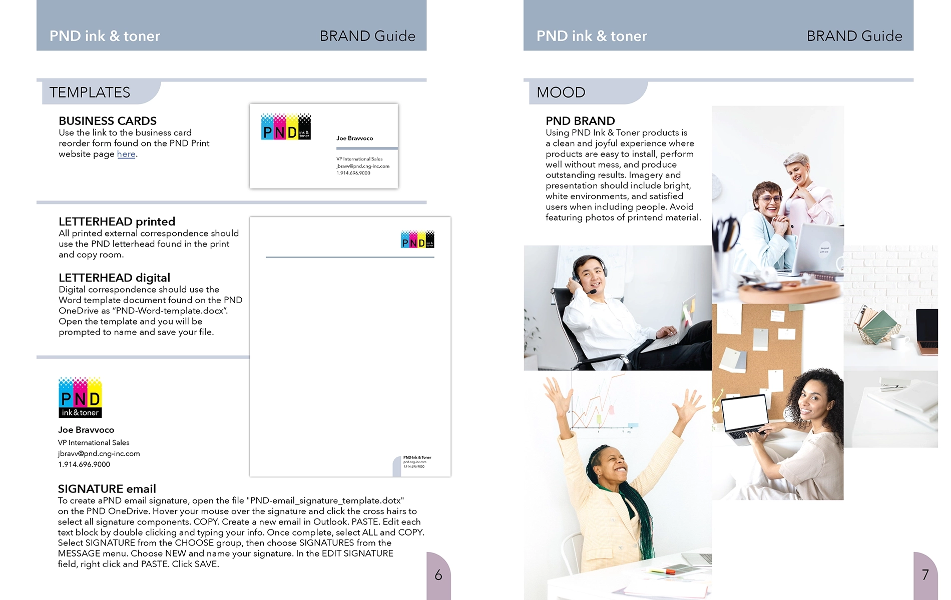The ink and toner business runs deep and wide. These products display branding from large corporations to one-person garage shops. PND needed a logo that presented them as a credible business providing a reputable product with immediate recognition. The primary ink colors of cyan, magenta, yellow, and black guarantee association with inkjet cartridges and a spray dot pattern presents each color to reinforce the connection. The company name is printed above in black and white for maximum contrast. The logo clearly identifies the type of business and utilizes pure, saturated colors and high contrast to convey the qualities buyers seek in ink and toner. Brand guidelines support the logo through precise instructions for use, ensuring compliance and messaging consistency. The guide also includes secondary colors, logo files, graphic assets, presentation template designs, letterheads, business cards, digital signature, and creative direction to communicate brand culture. This branding solution gives PND a turn-key tool to launch and run its business confidently.